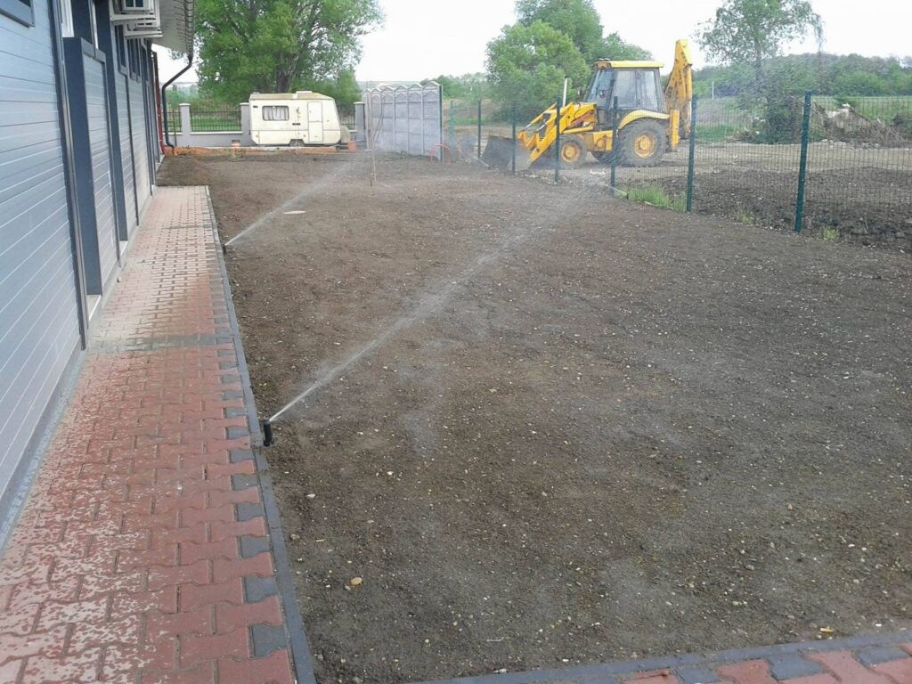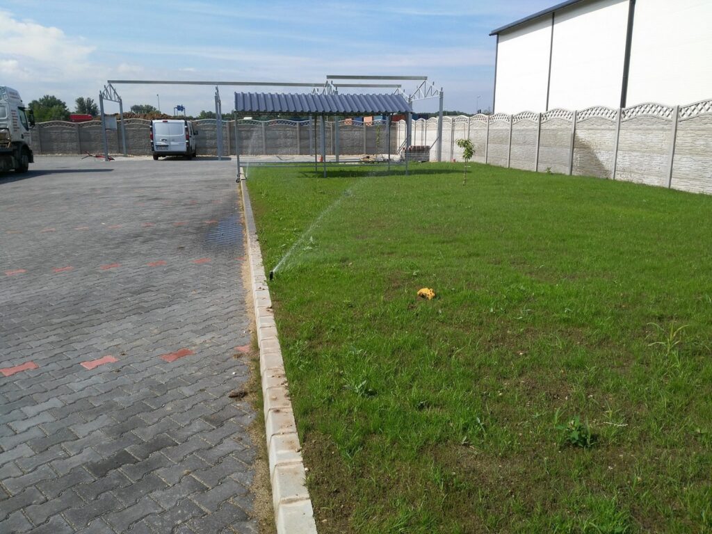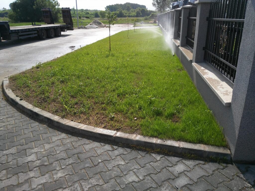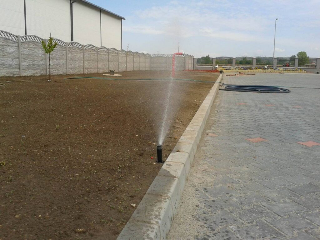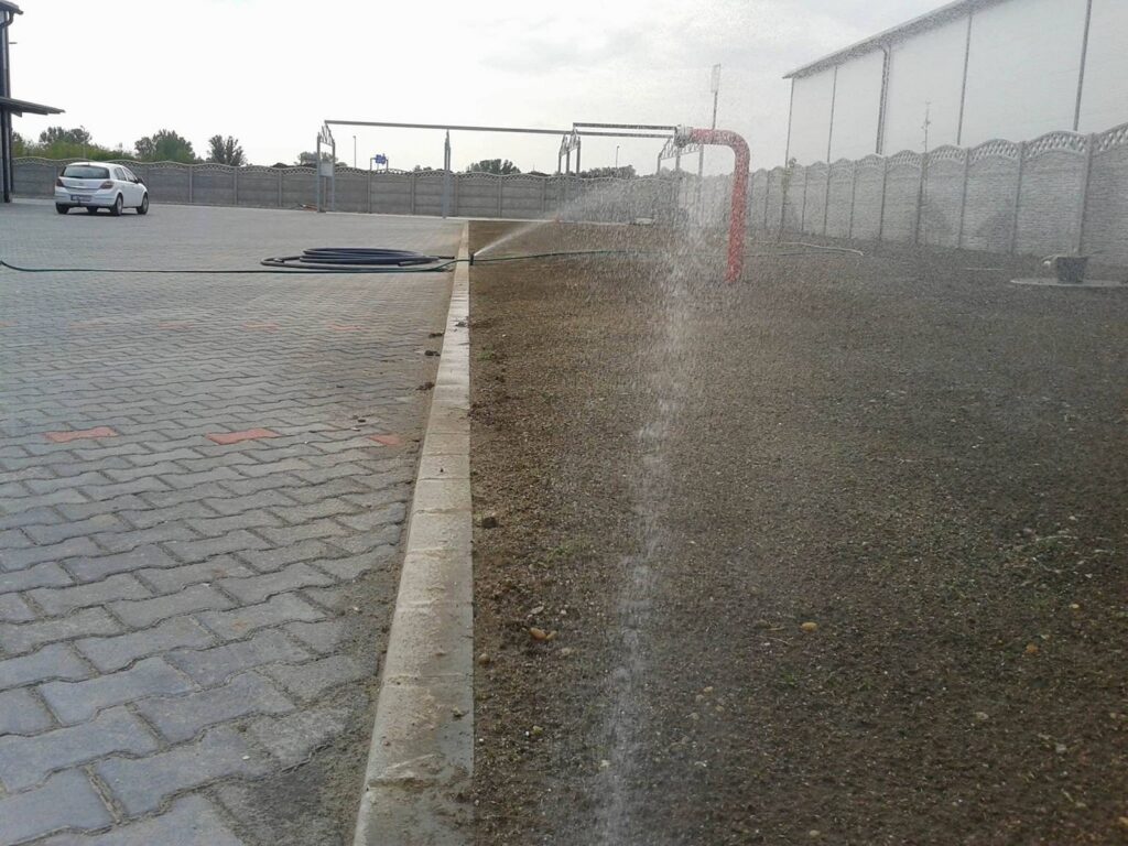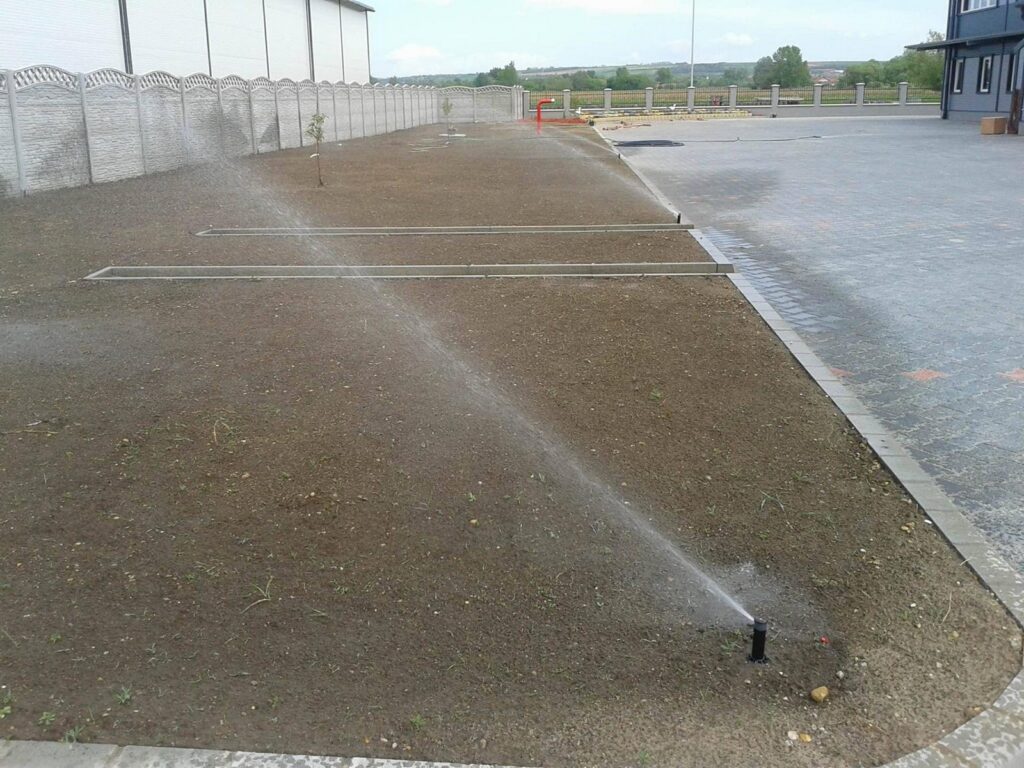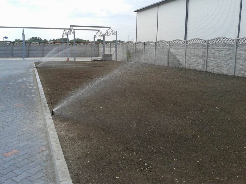 Ebben, a megközelítőleg 3000 m2-es ipari parkban is elengedhetetlenül szükséges volt az automata öntözőrendszer beépítése ahhoz, hogy a kötelező zöldfelület létrehzás ne csak egy múlékony díszlet legyen, hanem valóban hosszú távon szolgálja a gyep és a növények öntözését és minimalizálja a kosz és por jelenlétét. K-Rain és Orbit öntözéstechnikai márkákat használtunk a megépítésnél, amihez esőérzékelőt is csatlakoztattunk a felesleges vízfogyasztás elkerülése véhgett. Ezzel is csökkentve a vízfogyasztást. A munka elvégzése 5 napott vett igénybe.